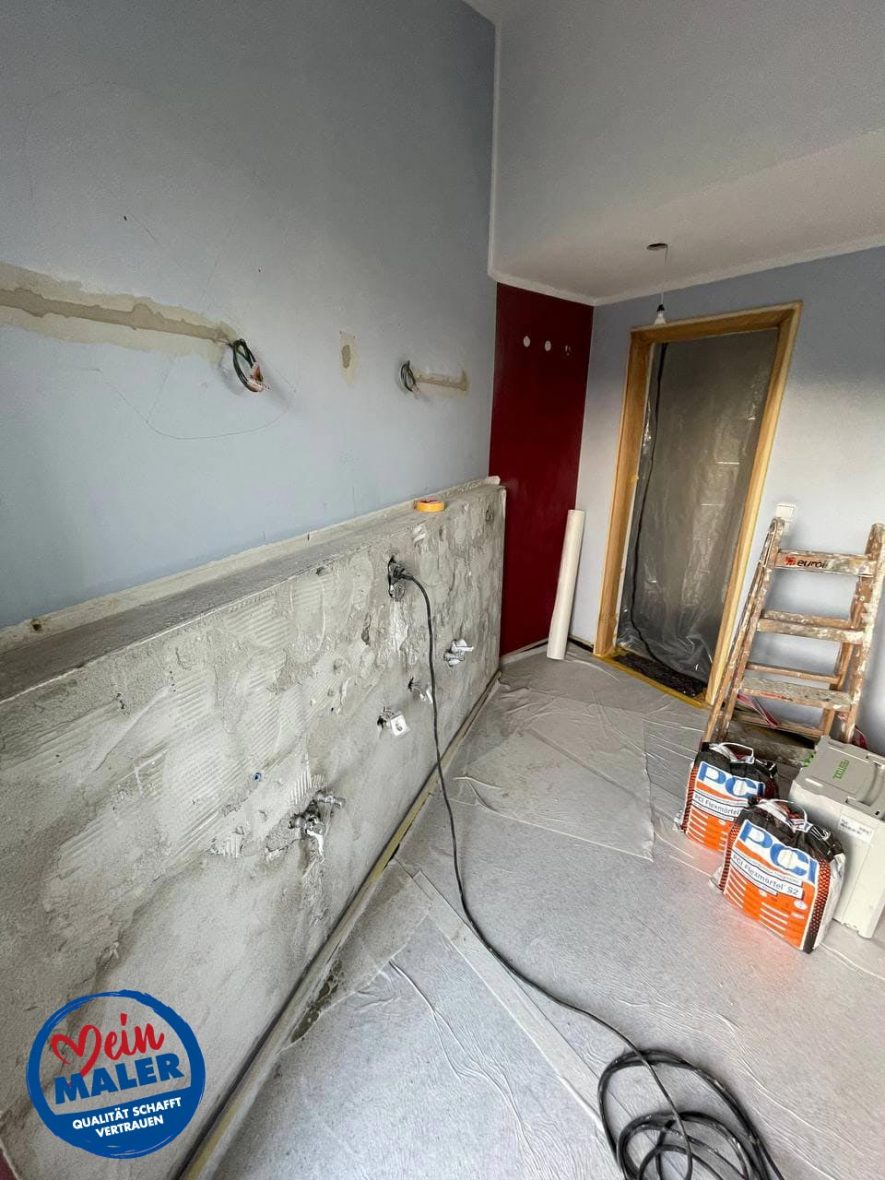 Am ersten Tag wurde erst einmal alles sauber abgeklebt und eine Bestandsaufnahme der vorhandenen Wandflächen durchgeführt. Im Anschluss haben wir die neu gestellten Wände erstmal verputzt und die Risse in den Bestandswänden geöffnet. Die neuen Rohrleitungen wurden eingeputzt, Eckschutzschienen gesetzt und großflächig mit einem Armierungsgewebe versehen.