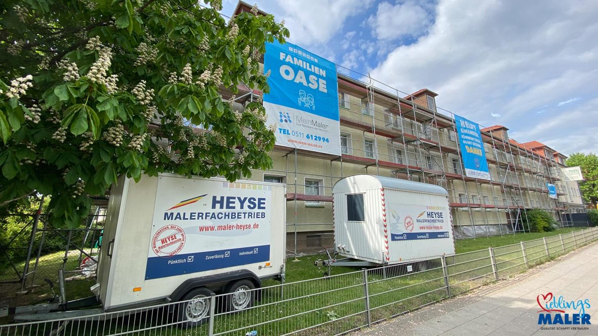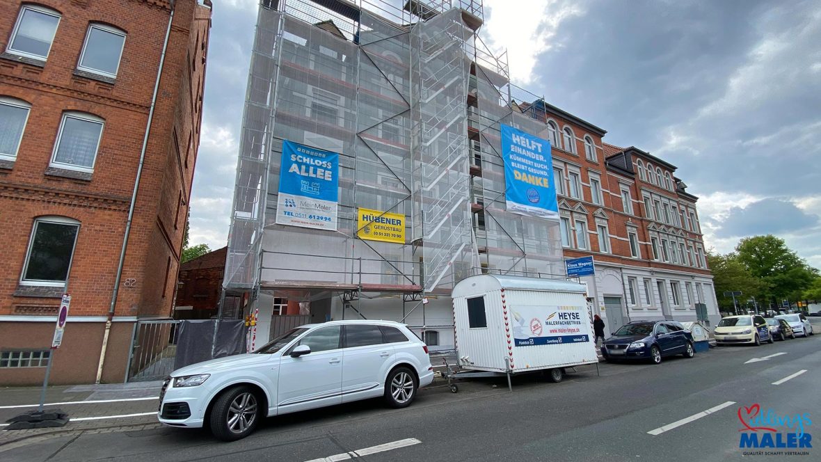 Da bin ich wieder und schön, dass Du da bist und unseren Blog liest. Heute möchte ich Dir mal ein paar Bilder von unseren Baustelleneinrichtungen zeigen und darüber bloggen, warum wir darauf so einen großen Wert legen. Ich mag es sehr, wenn unsere Baustellen in vielen Stadtteilen Hannovers zu erkennen sind und Passanten sich daran erinnern, wer dort die Fassade renoviert hat. Ganz besonders liebe ich es Geschichten über unser Wirken zu erzählen und wie unsere top Mitarbeiter ihr Handwerk erledigen, schöne Arbeiten realisieren und wir auch einen Blick hinter die Kulissen liefern können. Also somit Stories produzieren, die wir dann im Blog kommunizieren. Natürlich braucht man dafür eine Bühne und die brauchen ein Bühnenbild. Gerüste und Baustelleneinrichtungen bieten davon extrem viel an. Schaut mal…