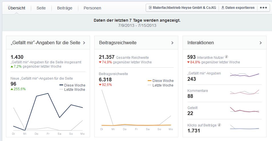 Übersicht Holen Sie sich einen 7-Tages-Schnappschuss der wichtigsten Aktivitäten auf Ihrer Facebook-Fanpage