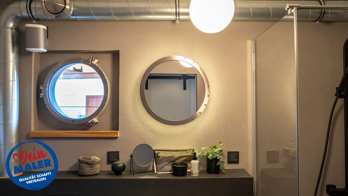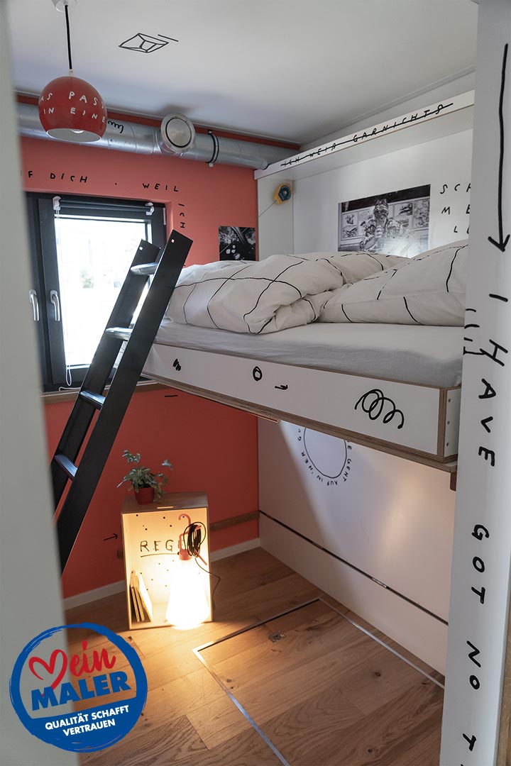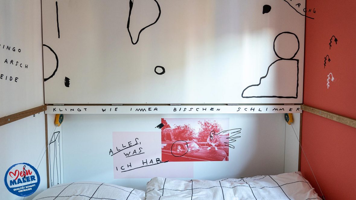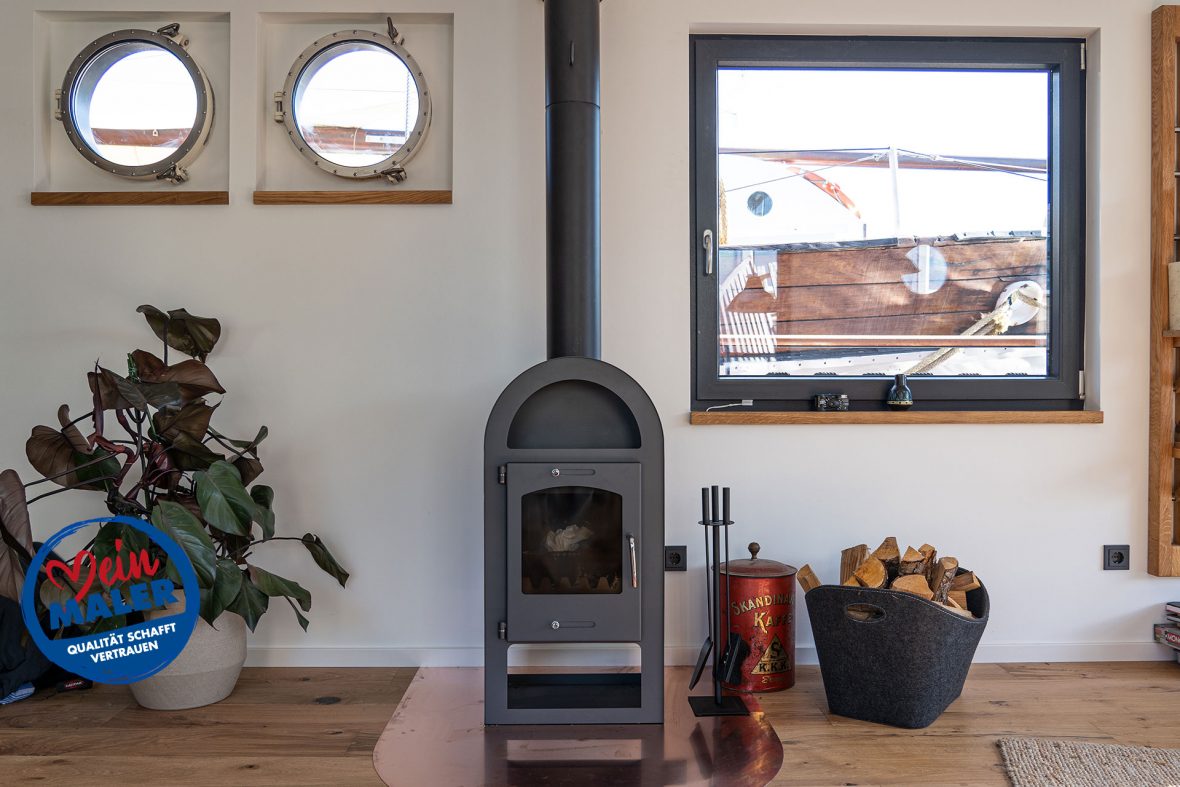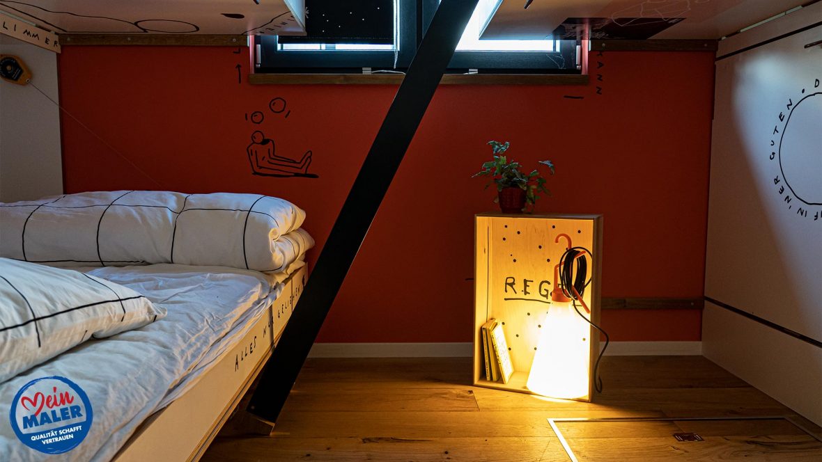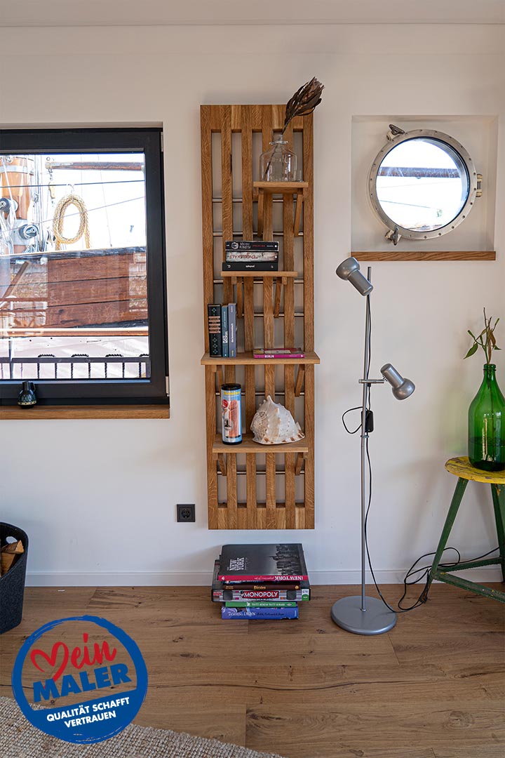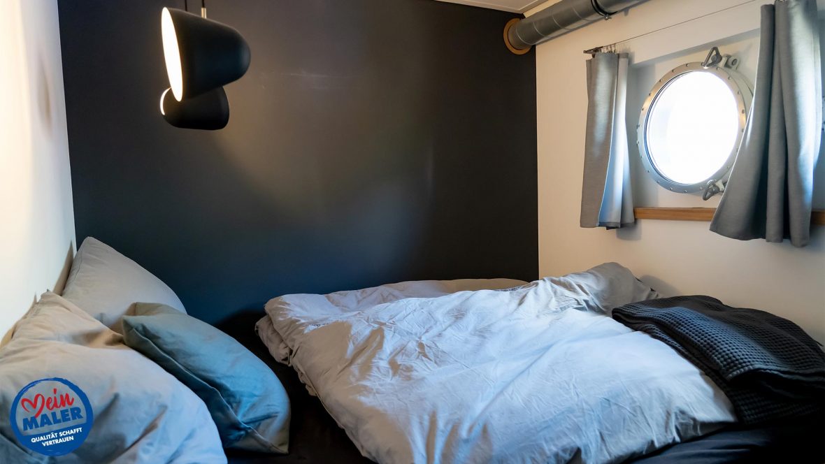 Für die einzelnen Räume des Hausbootes habe es ein stilvolles und modernes Farbkonzept von einer Innenarchitektin gegeben. „Jeder Raum hat einen eigenen Charakter und Olli und Fynn haben sich für ihre Schlafzimmer je eine eigene Farbe ausgesucht“, sagt der Malermeister. Ollis Kajüte ist in einem gelben Ton gehalten. Fynns Zimmer erinnert mit den Farben weiß und rot an einen Leuchtturm. Nach dem Spachteln und Streichen der Wände haben Künstler die Räume verziert und ihnen Ihre abschließende Einzigartigkeit verliehen.