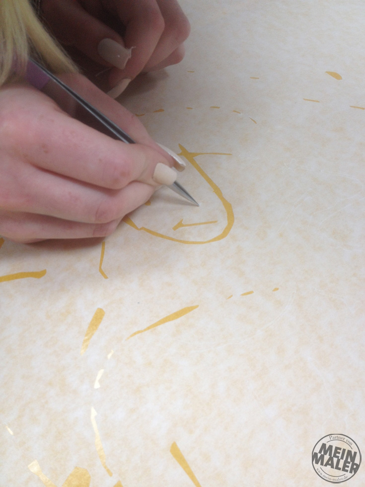 Als Highlight haben wir eine Wand mit Volimea, im Farbton No. 26 Kaminrot, gespachtelt und strukturiert. Auf dieser tollen Oberfläche haben wir dann das Motiv als Fresko gestaltet. Dabei war es vor allem extrem wichtig, den genauen Zeitpunkt zu treffen. Der Volimea Putz musste noch so frisch sein, dass sich Pigment mit Putz verbindet und die endgitterte Klebeschablone sich nicht in den Untergrund eindrückt.