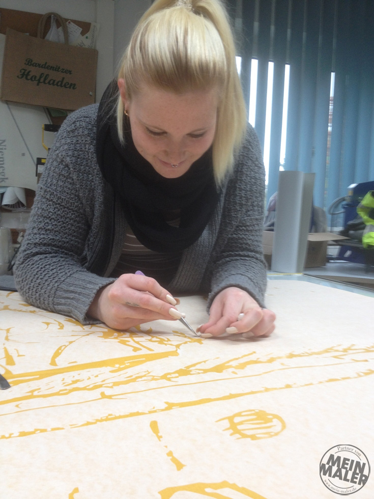 Die Auftragsvorbereitung war schon sehr speziell, es sollte eine Schablone 1,20 m x 2,00 m angefertigt werden. Das Motiv war eine Zeichnung vom Kunstmaler Walter Lauche aus dem Jahr 2000. Das Motiv ,,Gaststätte Treffpunkt‘‘ wurde damals mit einem Stiel aus Schafgabe und Tusche gezeichnet. Diese Zeichnung hatte viele filigrane Einzelelemente, die unsere Mitarbeiterin Angelique mit sehr viel Genauigkeit und Geduld endgittert hat.