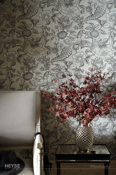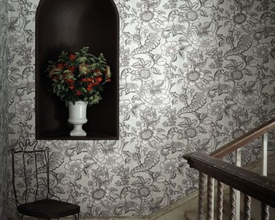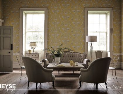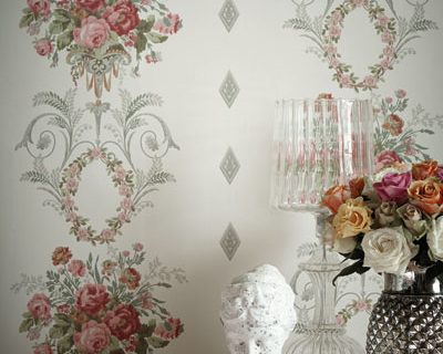 Versailles ist eine Tapete, die etwas später entstanden ist, als ihr traditionelles Design vermuten lässt. Sie basiert auf einem Originaldokument, das mit Farbabstufungen maschinell bedruckt wurde, um ihr einen Trompe-l’œil-Effekt zu verleihen. Ganz im klassischen Stil des Rokoko-Stucks weist sie aufwändige Schnörkel und eine große Fülle von Blumen auf.