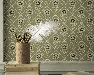 Dieses Muster wurde in der Grafschaft Surrey in einem mittelalterlichen Gebäude gefunden, das einst eine Schule beherbergte. Obwohl sie in England gedruckt wurde, weist diese Tapete eindeutig französische Einflüsse auf. Das Blumen-Gitter-Muster wurde zweifellos von Textildessins inspiriert, denn derart bedrucktes Leinen und Baumwollflanell war Mitte des 18. Jahrhunderts sehr beliebt.