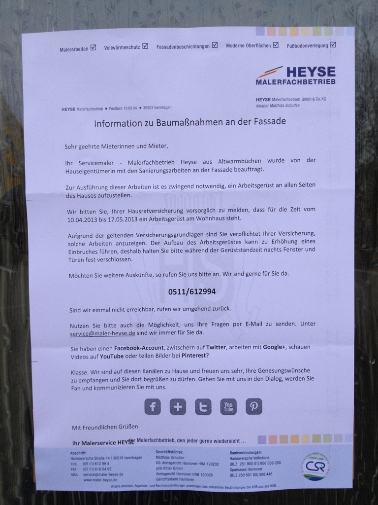 Start für die Schönheits-OP einer Fassade bekanntgegeben. Info an die Mieter verteilt und an die Haustür gehängt. Schaut mal rauf. Auch hier weisen wir wieder offline auf unsere Social-Media-Kanäle hin.