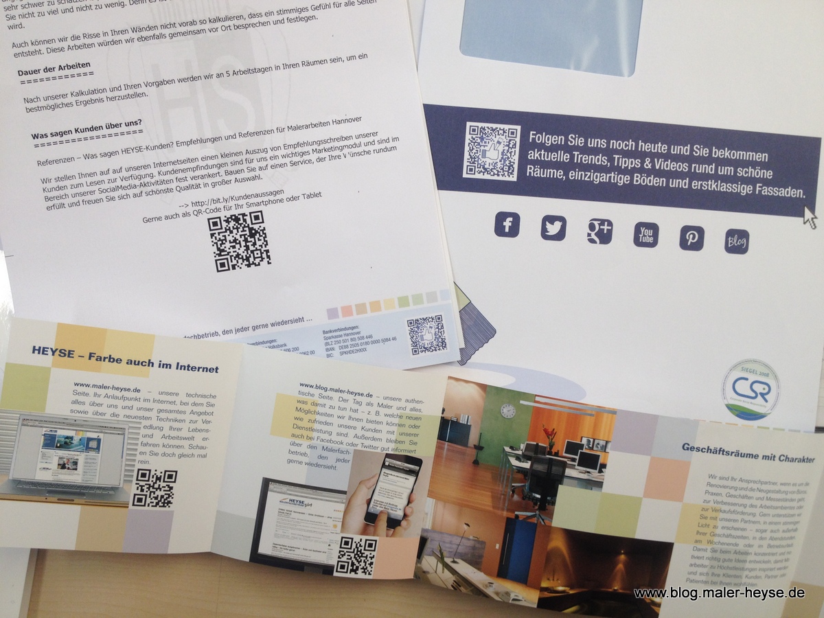 Im 1. QR-Code wird zur mobilen Landingpage gelinkt. Hier handelt es sich aussschließlich um das Thema „Post“. Das können Rechnungen, Angebote oder andere Schriftstücke sein, die wir mit der Post verschicken. Diese QR-Codes finden Sie ausschließlich auf unseren Briefumschlägen und Briefbögen. Mehr dazu, steht hier –> https://www.mein-maler.de/2013/06/14/mit-qr-codes-auf-printmedien-erzielen-sie-den-schnellsten-kontakt/